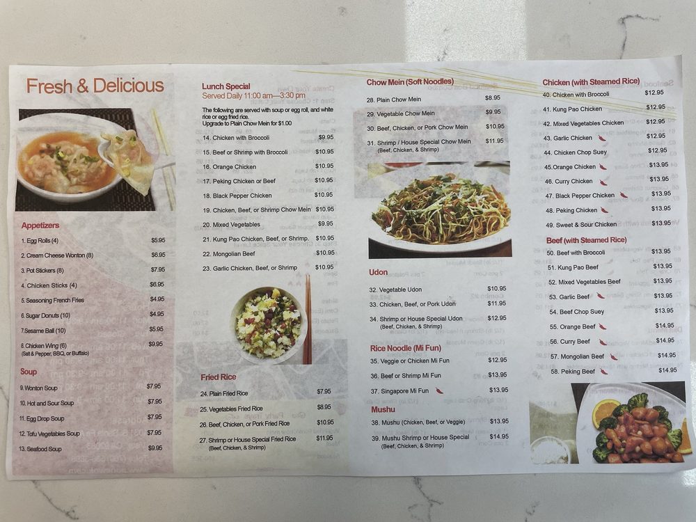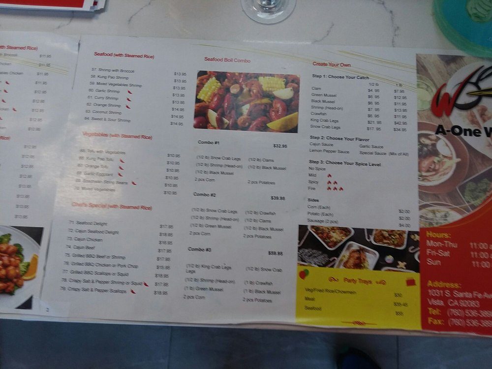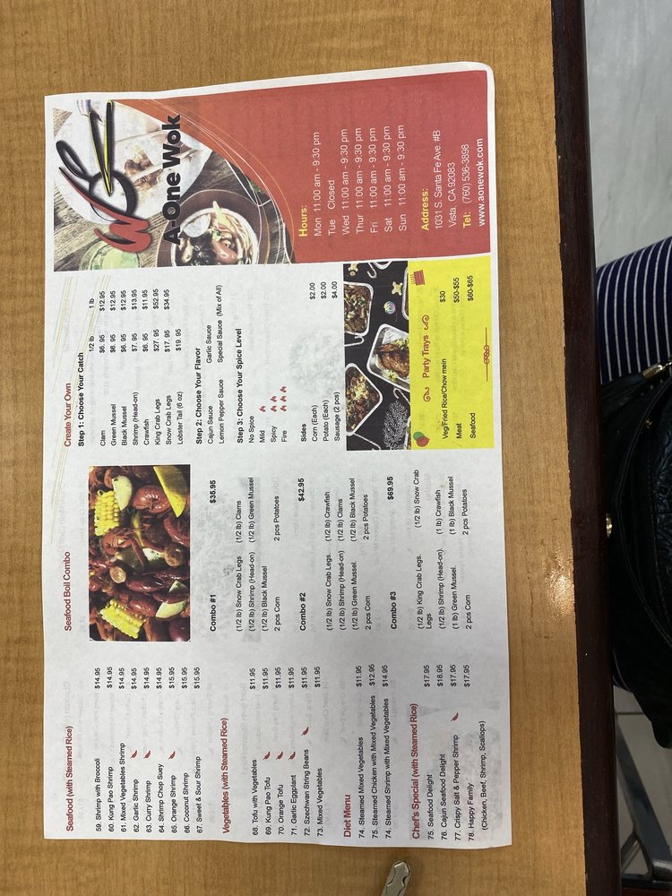 Introducing A-One Wok, a Chinese Seafood restaurant located in Vista, CA. This family-owned gem offers a variety of appetizers like Egg Rolls, Pot Stickers, and Sesame Balls, along with delicious soups such as Wonton and Seafood Soup. A standout feature is their Seafood Boil Combos, including options with snow crab legs, clams, shrimp, and more. Customers rave about the freshness and quality of the ingredients, as well as the generous portion sizes. The staff is friendly, and the service is quick, making it a top choice for Chinese takeout. With positive reviews highlighting dishes like Mongolian Beef, Orange Shrimp, and Lo Mein, A-One Wok is a must-try for anyone craving authentic Chinese cuisine.