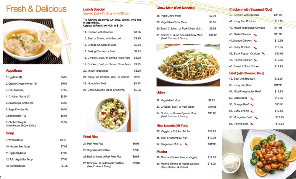 Chicken battered and cooked in a sweet orange sauce. Spicy.